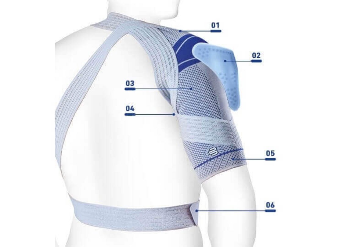 Le bandage OmoTrain soulève légèrement l'avant-bras et maintient la tête humérale en position centrée dans la cavité glénoïde. Le bandage est maintenu en place par une sangle qui entoure le torse sous le thorax et laisse la poitrine complètement libre. L'OmoTrain est donc agréable à porter.